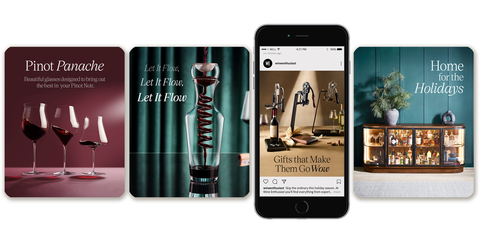 I led the creative execution of this project as a core function of my role at Wine Enthusiast. Responsible for the entire lifecycle of photography from conceptual development (visual concepts, moodboards, and styling briefs) to pre- and post-production oversight, including managing shot lists, scheduling, product logistics, print flatplans, and catalog planning.